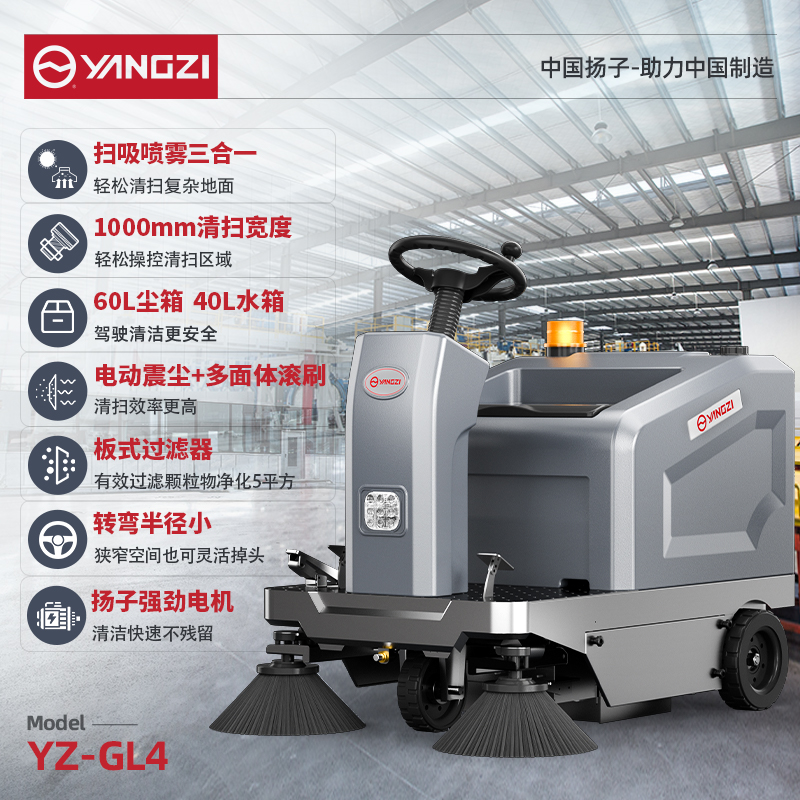 揚子掃地機(jī)YZ-GL4,60L集塵箱,1000mm清掃寬度,40L清水箱,高效清掃省心又省錢。